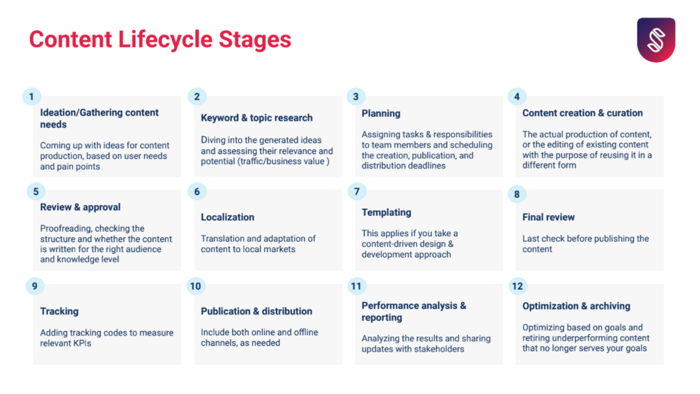 This template details the content lifecycle stages, from ideation and topic research to creation, distribution and optimization.